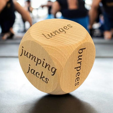 Grote massief beukenhouten dobbelsteen van 6 cm met gegraveerde zijden sport